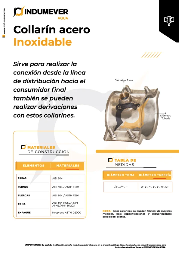 Sirve para realizar la conexión desde la línea de distribución hacia el consumidor final, también se pueden realizar derivaciones con dichos collares, están disponibles en las siguientes medidas (en pulgadas):