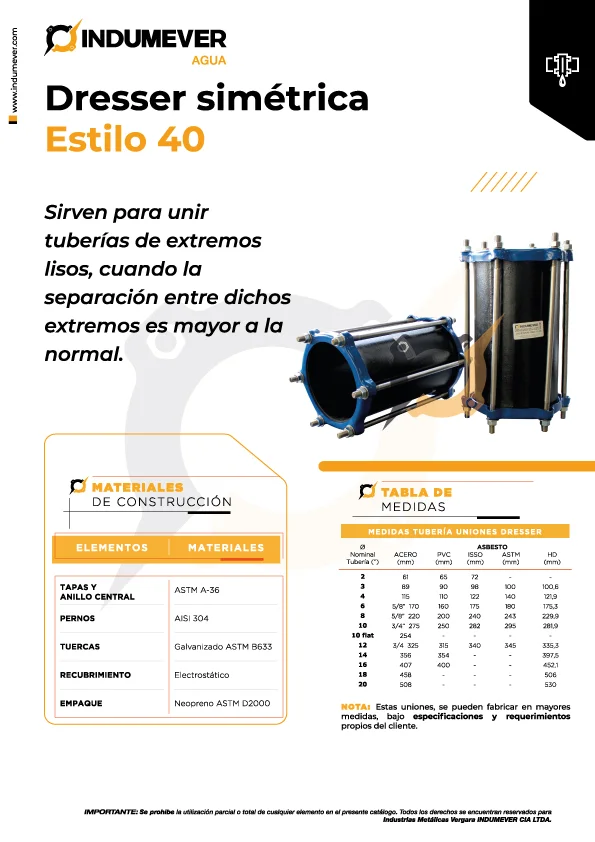 Dresser estilo 40 simétrica o dresser cuerpo largo sirve para unir tuberías de extremos lisos del mismo diámetro por ejemplos: Acero, PVC Hierro Dúctil, Asbesto-Cemento.